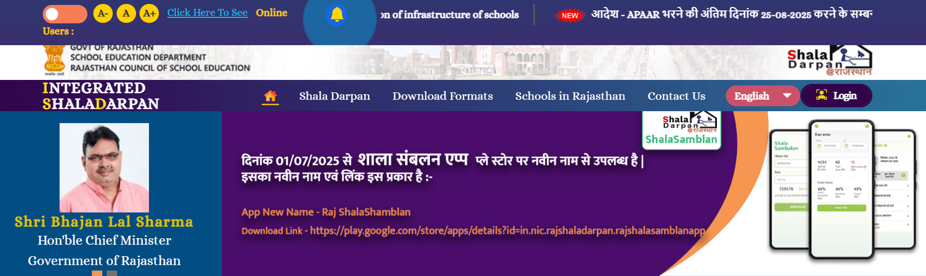 Shala Darpan is an Integrated School Management System launched by the Ministry of Education, Government of Rajasthan. The portal provides real-time information related to government schools, staff, students, and educational programs. By digitizing school records, it empowers both the education department and the public with easy access to essential data.